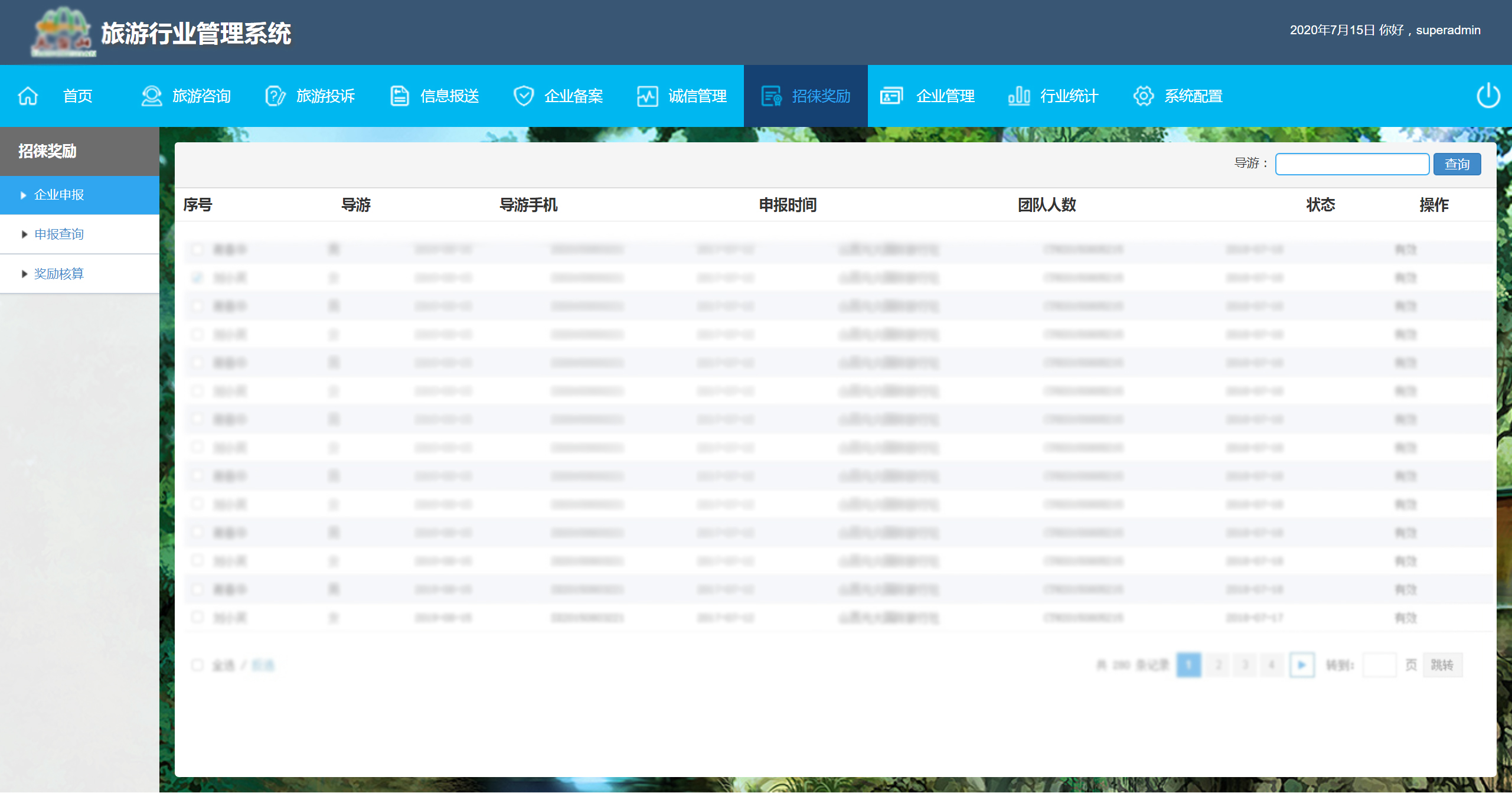 鼓勵各地旅行社帶團來本地旅游,旅游管理部門推出獎勵政策,刺激旅游發(fā)展。游客招徠獎勵系統(tǒng)結(jié)合旅游工作實際需求,融入流程優(yōu)化管理理念,運用“大數(shù)據(jù)、云計算”技術(shù)開發(fā)的通用性業(yè)務(wù)管理系統(tǒng)。