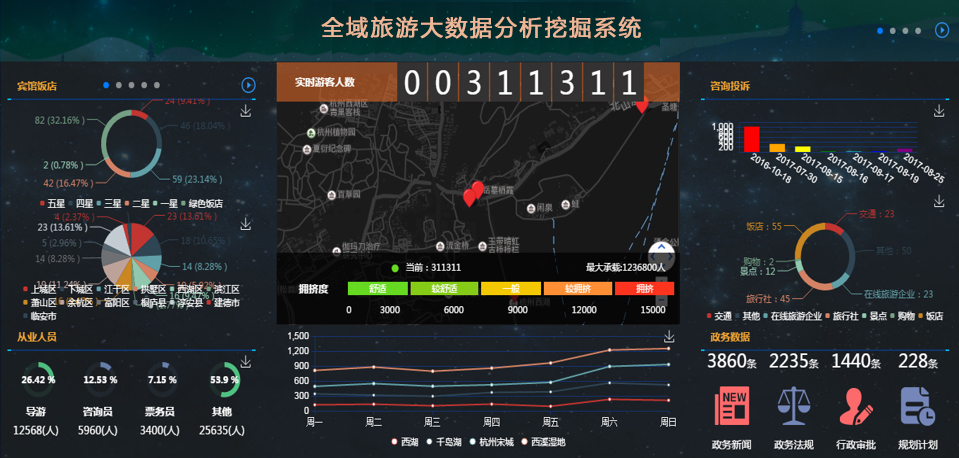 對(duì)全縣的旅游目的地資源數(shù)據(jù)、旅游投訴數(shù)據(jù)、游客屬性數(shù)據(jù)、客流量、旅游團(tuán)隊(duì)等數(shù)據(jù)進(jìn)行分析展示。