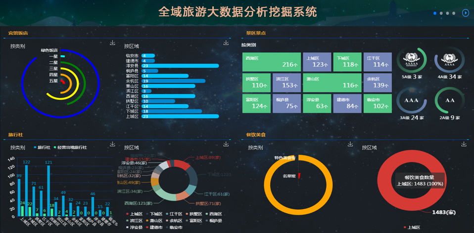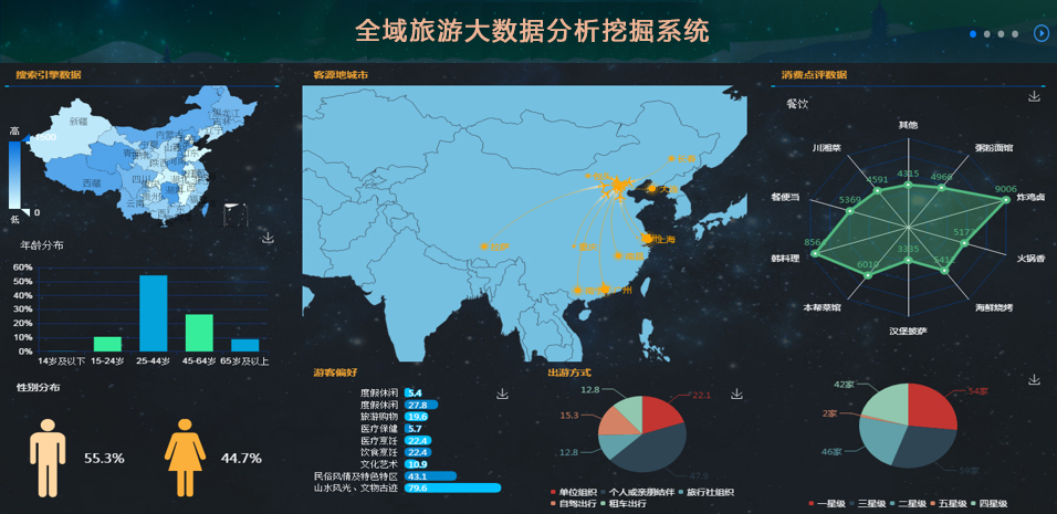 旅游產(chǎn)業(yè)分析需對(duì)吃住行游購(gòu)?qiáng)柿?lèi)旅游要素的數(shù)據(jù)進(jìn)行分析,并通過(guò)圖形圖表的方式進(jìn)行展示。