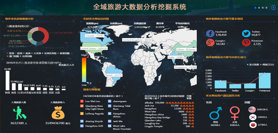 大數(shù)據(jù)展示的數(shù)據(jù)是對(duì)全域旅游大數(shù)據(jù)分析的總覽,并在系統(tǒng)的不同模塊中將旅游產(chǎn)業(yè)分析、旅游關(guān)注度分析、客源地分析、旅游目的地畫(huà)像、景區(qū)畫(huà)像、涉旅企業(yè)畫(huà)像、游客畫(huà)像的信息給展現(xiàn)出來(lái)。