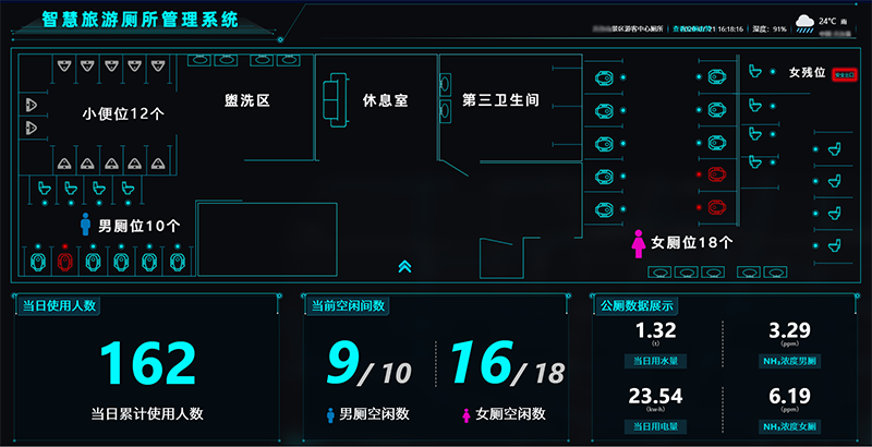 可以通過(guò)公廁外墻上的電子顯示屏,清晰的了解男、女廁和第三廁位分布情況,紅色亮起表示這個(gè)公廁目前有人使用。綠燈表示公廁空閑。通過(guò)這種直觀的方式就可以了解、判斷哪個(gè)廁位可用。公廁每個(gè)蹲位都安裝提供一鍵緊急呼叫按鈕,使用者按下呼叫鈴,工作人員將趕到廁所提供幫助。公廁門(mén)口架設(shè)蹲位顯示器,界面化的顯示廁所實(shí)際情況,同時(shí)還可以可投放第三方廣告商,第三方自動(dòng)售貨機(jī)。