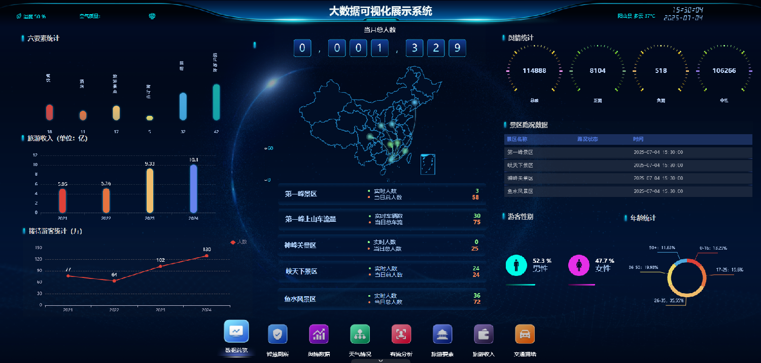 面向旅游管理機構(gòu),以“一張圖”為理想的概念規(guī)劃思路,基于GIS地理信息系統(tǒng),建設(shè)智慧景區(qū)旅游主題數(shù)據(jù)庫,實時獲取旅游景區(qū)、旅行社運行狀態(tài)信息,并面向旅游管理機構(gòu)、景區(qū)管理者,提供不同級別的旅游產(chǎn)業(yè)全鏈條的數(shù)據(jù)統(tǒng)計與數(shù)據(jù)智能分析界面,完全站在大數(shù)據(jù)洞察、大數(shù)據(jù)分析與大數(shù)據(jù)預(yù)測機制上,透過“一張圖”展示在旅游管理者眼前,實現(xiàn)基于景區(qū)旅游產(chǎn)業(yè)全鏈條的科學(xué)管理與決策模式,實現(xiàn)旅游管理可視化與精細化。