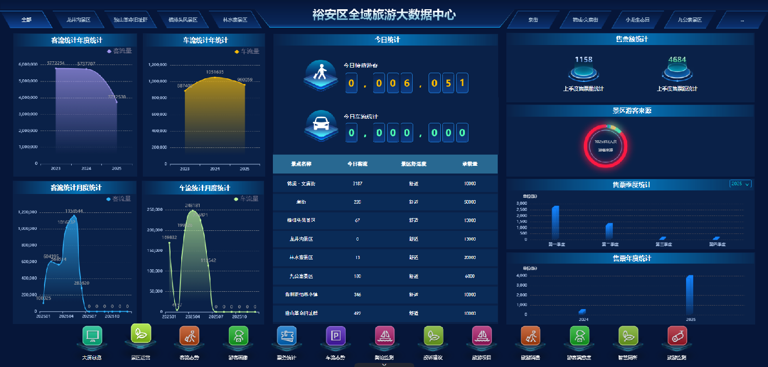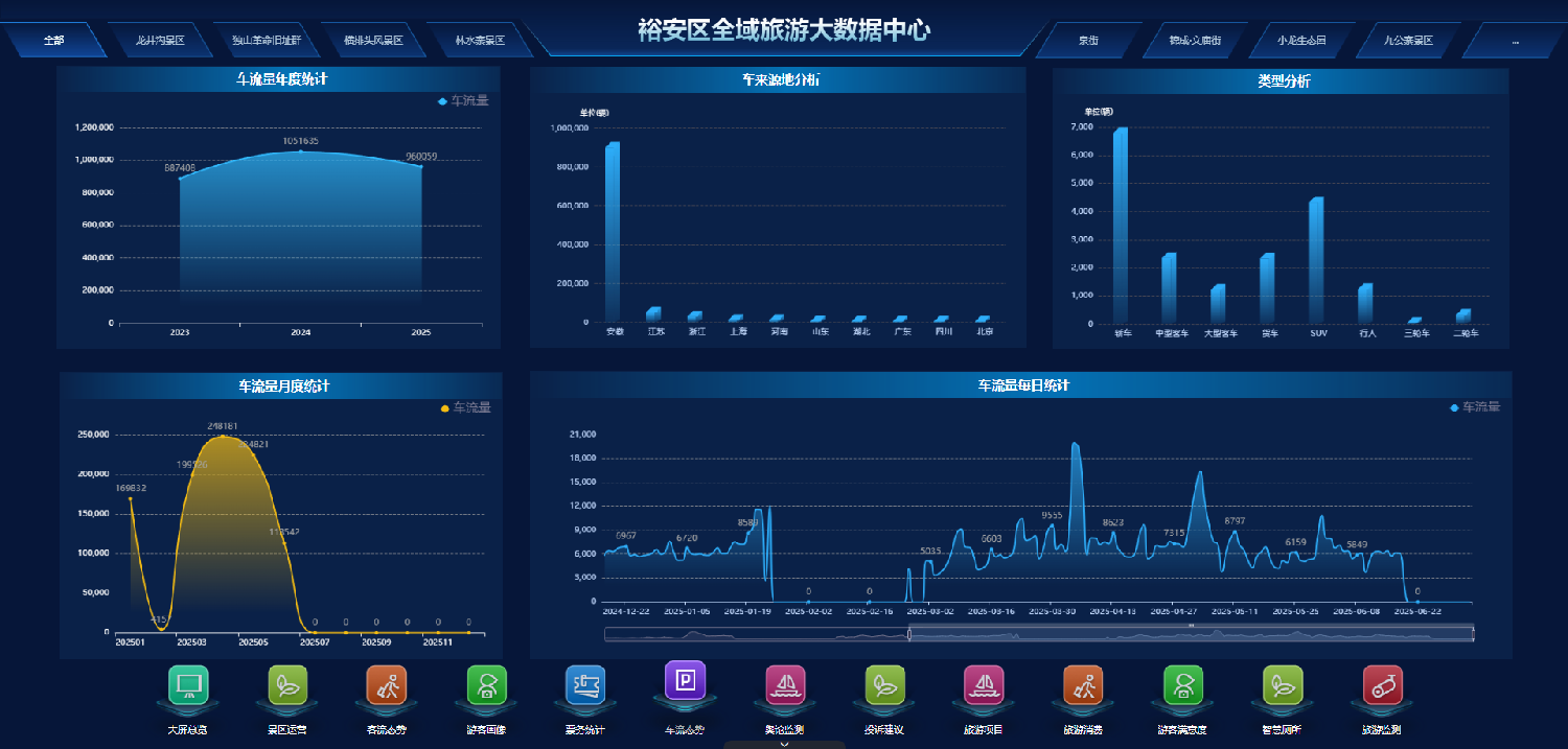 主要功能包含:旅游產(chǎn)業(yè)運(yùn)行狀態(tài)監(jiān)測(cè)、旅游產(chǎn)業(yè)運(yùn)行態(tài)勢(shì)分析和旅游產(chǎn)業(yè)運(yùn)行預(yù)警、景區(qū)運(yùn)營(yíng)分析、客流態(tài)勢(shì)分析、游客畫(huà)像分析、票務(wù)統(tǒng)計(jì)分析、車(chē)流態(tài)勢(shì)分析、輿情監(jiān)測(cè)分析、投訴統(tǒng)計(jì)分析等。