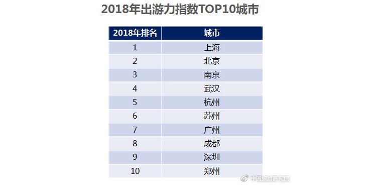 從區(qū)域分布來看,出游力指數(shù)仍呈現(xiàn)東南沿海地區(qū)較高、西北地區(qū)較低的局面,但中西部地區(qū)出游力指數(shù)與東部地區(qū)差距有所縮小。2018年全國城市居民出游力指數(shù)排名前十位的城市依次是上海、北京、南京、武漢、杭州、蘇州、廣州、成都、深圳、鄭州。(數(shù)據(jù)說明:城市出游力指數(shù)是指該城市居民旅游消費支出占該城市居民消費總支出的比重)