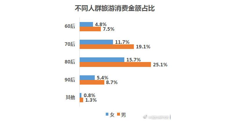 報告顯示,旅游消費人群中,買單男性多于女性,70后及80后人群為主力消費人群,90后人群數(shù)量快速增長。從旅游消費金額來看,80后男性旅游消費貢獻最高,占比超25%。