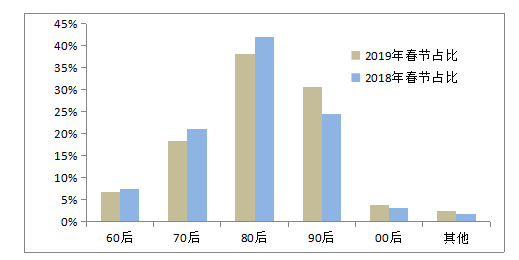 旅游過年追求生活品質(zhì)。中國旅游研究院與銀聯(lián)商務(wù)聯(lián)合實驗室數(shù)據(jù)顯示,2019年春節(jié)期間高品質(zhì)住宿設(shè)施消費人次增長超過45.3%,較上年同期提高7.7個百分點。其中35-44歲之間的男性支付占比最高,達(dá)到28.1%。此外,2019年春節(jié)期間游客餐飲日均消費筆數(shù)較節(jié)前提高43.7%,其中80后餐飲消費總金額最高。中國旅游研究院與深大智能聯(lián)合課題組研究發(fā)現(xiàn),通過在線平臺購買旅游吸引物門票的游客中,80后同樣居于領(lǐng)先位置,與90后的差距明顯縮小。