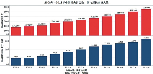 十年間,我們在旅途中的時間越來越多,也有越來越多的人踏上旅途。據(jù)國家統(tǒng)計局數(shù)據(jù)顯示,2018年中國國內(nèi)游客出游55.4億人次,這一數(shù)據(jù)是2008年17.1億人次的3倍還要多;2018年中國居民出境人數(shù)達1.62億人次,而在2008年只有4584萬人次。