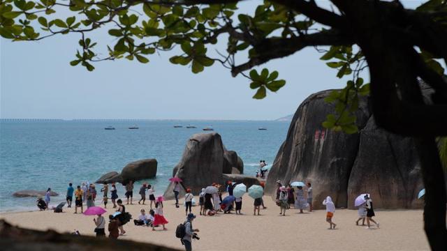 在海南省三亞市天涯海角旅游景區(qū),游客在參觀游覽(4月13日攝)。新華社記者 李夢(mèng)嬌 攝