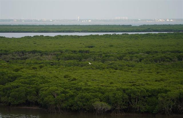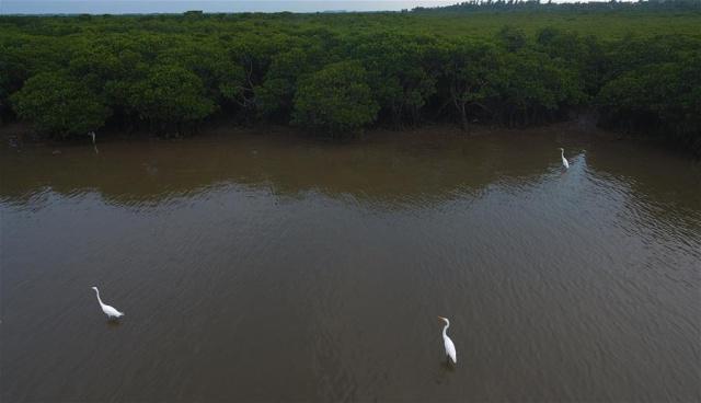 在海南東寨港國(guó)家級(jí)自然保護(hù)區(qū),白鷺在保護(hù)區(qū)紅樹林附近休憩(4月10日無(wú)人機(jī)拍攝)。 新華社記者 楊冠宇 攝