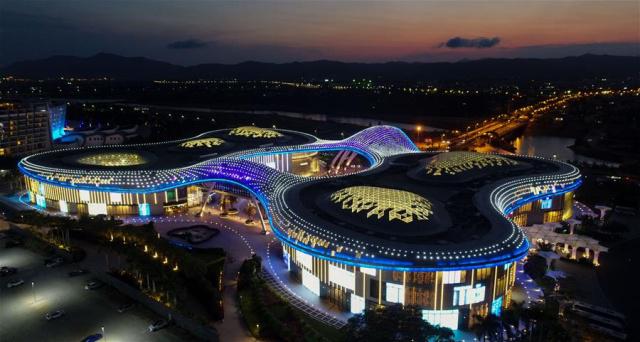 位于海南省三亞市海棠灣的三亞國(guó)際免稅城夜景(4月13日無(wú)人機(jī)拍攝)。 新華社記者 楊冠宇 攝