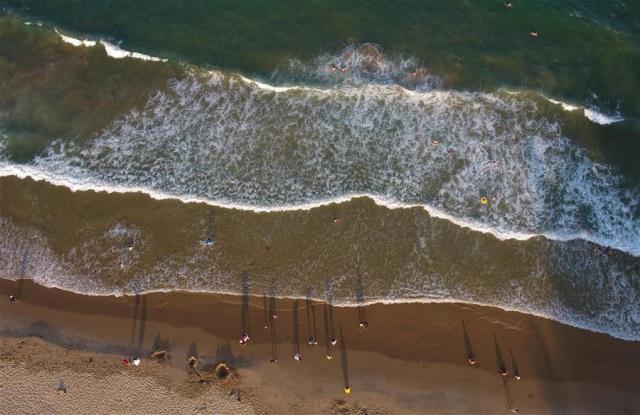 游客在海南省三亞市海棠灣海灘上游玩(4月13日無(wú)人機(jī)拍攝)。新華社記者 賀燦鈴 攝