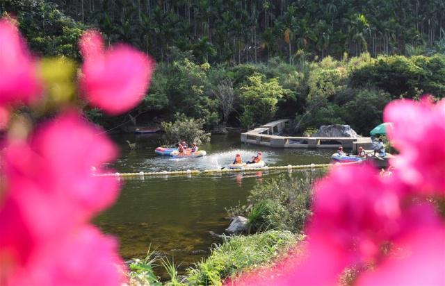 游客在海南省瓊中黎族苗族自治縣瓊中峽體驗(yàn)漂流(4月11日攝)。新華社記者 賀燦鈴 攝