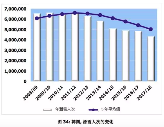值得重點關(guān)注的是,2018 年平昌冬奧會的召開,完全沒能提高滑雪在韓國的受歡迎程度。2017-2018年雪季的滑雪人次較前一年大跌10%,較 5 年平均水平下降 20%。