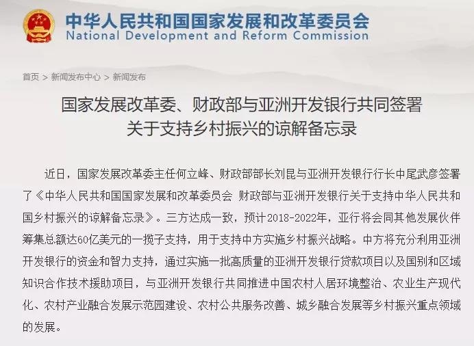 亞洲開(kāi)發(fā)銀行:國(guó)家發(fā)展改革委、財(cái)政部、亞洲開(kāi)發(fā)銀行三方達(dá)成一致,預(yù)計(jì) 2018-2022 年,亞行將會(huì)同其他發(fā)展伙伴籌集總額達(dá) 60 億美元的一攬子支持,用于支持中方實(shí)施鄉(xiāng)村振興戰(zhàn)略。