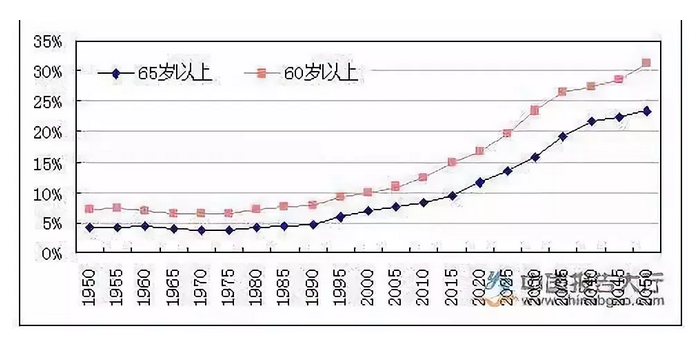 據(jù)資料顯示,中國(guó)的老齡化擁有兩個(gè)世界第一:一是老齡人口數(shù)量世界第一;二是老齡化速度世界第一。世界上還沒(méi)有任何一個(gè)國(guó)家,老化得像中國(guó)這么迅速。預(yù)計(jì)到2020年,我國(guó)60歲以上老人將超過(guò)2.5億,占比為17.5%。2025年,我國(guó)60歲以上老人將達(dá)到3億,占比為21%,65歲以上老年人比例也將達(dá)到13.7%,接近深度老齡化社會(huì),我國(guó)將在2027年進(jìn)入深度老齡化社會(huì)。而世界衛(wèi)生組織的預(yù)測(cè),2033年前后中國(guó)老齡人口將翻番到4億,到2050年,中國(guó)將有35%的人口超過(guò)60歲,成為世界上老齡化最嚴(yán)重的國(guó)家。