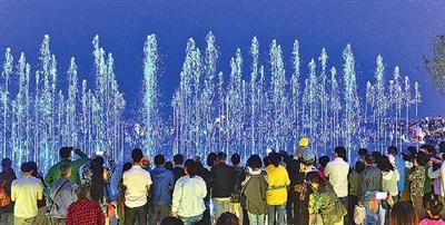■石老人海水浴場水秀廣場音樂噴泉吸引眾人觀看。陳錫柱 攝