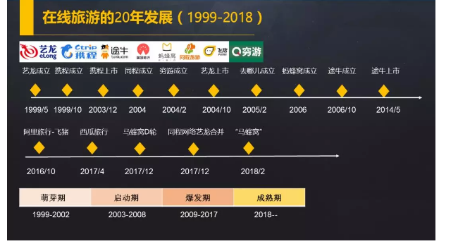 這是一張?jiān)诰€(xiàn)旅游發(fā)展關(guān)鍵節(jié)點(diǎn)的時(shí)間圖,大致可以分為4個(gè)時(shí)期,從1999年攜程藝龍成立的萌芽期,到2003年-2008年間的啟動(dòng)期。