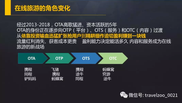 在線(xiàn)旅游已經(jīng)從單純OTA(代理)到OTP(平臺(tái))到OTC(內(nèi)容)到OTS(服務(wù))多種模式并存和角色的遷移,只做賣(mài)貨渠道的公司,已經(jīng)沒(méi)有持續(xù)生存的空間。