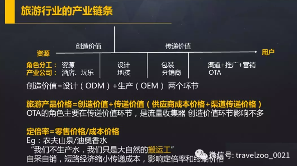 我們今天看到的旅游供應(yīng)商、資源商其實(shí)是在創(chuàng)造價(jià)值環(huán)節(jié),而OTA、線(xiàn)下門(mén)店、旅游分銷(xiāo)商、對(duì)產(chǎn)品的推廣、宣傳都是在傳遞價(jià)值環(huán)節(jié)。