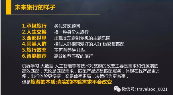 總結(jié)一下:無(wú)論未來(lái)技術(shù)多么強(qiáng)大,依然不會(huì)改變旅游的本質(zhì)——也就是基于每個(gè)人的真實(shí)的體驗(yàn)需求。