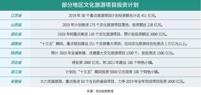 從各省份重點(diǎn)項(xiàng)目推進(jìn)計(jì)劃上看,各地方政府對于發(fā)展文化旅游業(yè)的決心也可見一斑。據(jù)了解,在已公布的各省級行政單位重點(diǎn)項(xiàng)目計(jì)劃中,文旅項(xiàng)目的投資都成為其中重要的板塊。與此同時,個別省份在2019年計(jì)劃推進(jìn)的重點(diǎn)文化旅游項(xiàng)目甚至達(dá)上千個,計(jì)劃投資總額最高達(dá)3000億元。