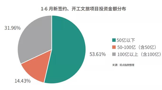 從單體項(xiàng)目投資金額上看,文旅項(xiàng)目表現(xiàn)出向大體量、高投入發(fā)展的趨勢。今年1-6月新簽約、開工文旅項(xiàng)目中,單體項(xiàng)目投資金額在50億以下的依然在大多數(shù),占總投資項(xiàng)目的53.61%;50-100億(含50億)投資金額的項(xiàng)目占比為14.43%。