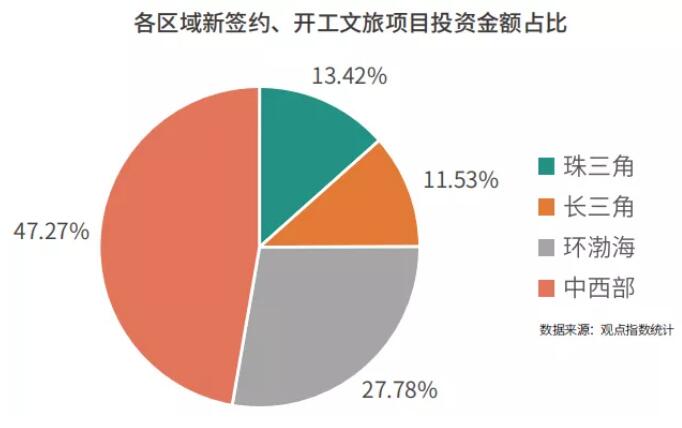 上半年,珠三角、長三角、環(huán)渤海、中西部區(qū)域新簽約、開工文旅項(xiàng)目涉及投資金額占新增投資總金額分別為13.42%、11.53%、27.78%、47.27%,其中,中西部地區(qū)幾乎占了1-6月新增文旅項(xiàng)目總投資的一半。