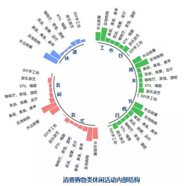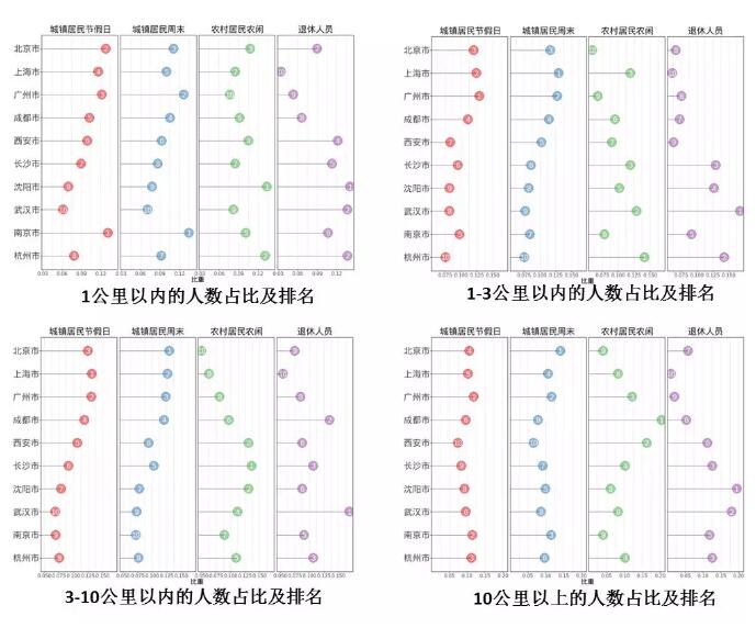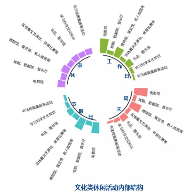 從國民休閑行為的區(qū)域差異來看,在調(diào)研的10個城市中,北京、上海、廣州、成都4市城鎮(zhèn)居民在周末、節(jié)假日更喜歡外出休閑,其選擇在離家3-10公里范圍內(nèi)進行休閑的人數(shù)占比具有絕對優(yōu)勢;長沙、西安、沈陽、武漢4市的農(nóng)村居民在農(nóng)閑時喜歡到離家3-10公里范圍內(nèi)進行休閑;沈陽、武漢、長沙、杭州4市退休居民則喜歡遠距離休閑。從休閑內(nèi)容來看,北京、上海、廣州、成都4市城鎮(zhèn)居民在周末、節(jié)假日喜歡旅游、消費購物和參與文化類休閑活動,其中,選擇消費購物的人數(shù)占比在10個城市中具有絕對優(yōu)勢;武漢、長沙、廣州、西安4市農(nóng)村居民農(nóng)閑時喜歡文化類休閑活動,而沈陽、杭州等市農(nóng)村居民農(nóng)閑時更喜歡消費購物;武漢、沈陽、杭州等市退休人員更喜歡旅游和體育健身。