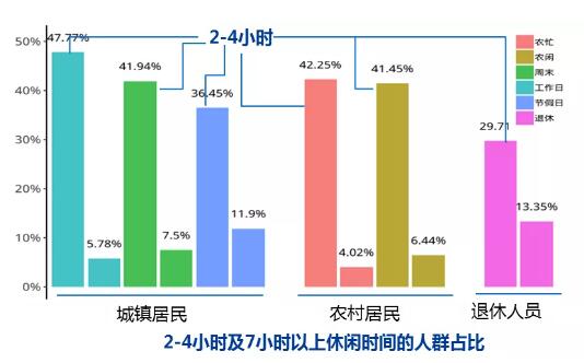 從休閑時間來看,城鄉(xiāng)居民休閑時間隨可支配時間變化而波動,工作日和農(nóng)忙期間城鄉(xiāng)居民勞動強度大,可支配時間少,休閑時間相對較短;城鄉(xiāng)居民每日休閑時間平均以2-4小時為主。數(shù)據(jù)顯示,33.6%的受訪城鎮(zhèn)居民工作日工作時間達9小時以上;有40%的城鄉(xiāng)居民在工作日、周末、農(nóng)忙、農(nóng)閑時每日休閑時間為2-4小時,而休閑時間7小時以上的城鄉(xiāng)居民占比隨可支配時間增多而依次提升;退休無業(yè)人員由于不受時間限制,休閑時間7小時以上的受訪者占比最高,為13.4%。