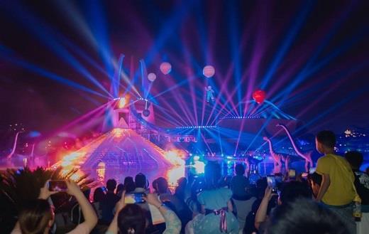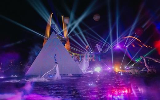 去年7月1日,恐龍園大型沉浸式夜游項(xiàng)目D秀首演。夜幕下的恐龍園,日常隱于水底的一座“金字塔”緩緩升起,“金字塔”以4K投影漆為表面,遍布智能光路系統(tǒng),夜間自帶360°科幻流光效果,并搭載了10個(gè)脈沖點(diǎn)火噴射裝置,應(yīng)用“明火不著”的特殊生物脂油,破水而出后,仍可呈現(xiàn)8米高的火焰噴射、氣爆效果。此外,恐龍園還為D秀原創(chuàng)了長(zhǎng)達(dá)8分鐘影視效果,設(shè)計(jì)了侏羅紀(jì)森林、神秘深海、冰封地球等七大場(chǎng)景,其中僅一段數(shù)十秒鐘的河流瀑布的超長(zhǎng)鏡頭,就細(xì)膩地呈現(xiàn)出湍急的河流、壯觀的瀑布、慘烈的災(zāi)難等震撼特效。