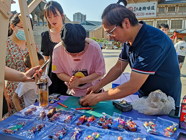 一個是面塑作品,一個是版畫藝術;一位是非遺傳承人,一位是21歲的在校大學生。不久前,在陜西西安大唐市金市廣場上的西安市非遺項目文創(chuàng)研發(fā)展示活動現(xiàn)場,一位來自西安美術學院多位學子的作美術作品受到廣大市民和游客的關注。所有作品不僅展示了青年畫家對于非遺的觀察和理解,同樣成為傳統(tǒng)手藝的當代宣傳畫,頗具觀賞性及廣告價值。
