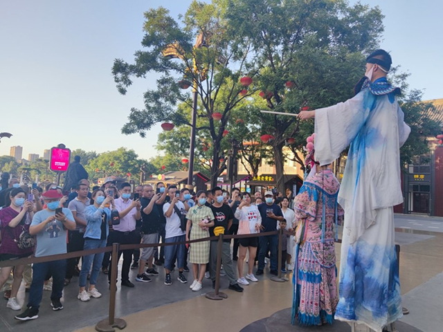 五光十色,夜夜生輝。伴隨著夜幕降臨,西安大唐不夜城迎來了一天中最熱鬧的時刻,燈光、演出、美食、文創(chuàng),叫好聲、歡呼聲,游客流連忘返在不夜城,也“叫醒”了夜經(jīng)濟。作為首批全國示范步行街之一,大唐不夜城用心打造夜景,從石頭人和扮演兵馬俑的網(wǎng)紅,到分布其中的文創(chuàng)店、非遺展位,體現(xiàn)出西安的文化特征,傳播著古城的文化魅力。