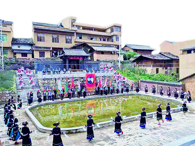 王秉??既∵M(jìn)士時的答卷,他闡明“乃合天下之大,而業(yè)足以蓋之。極萬世之遙,而德足以垂之”的觀點(diǎn),演藝廳中有一副“三鳥共一嘴圖”,寓意人要尊重自然、保護(hù)萬物、和諧共處,現(xiàn)今,這幅圖有了新的寓意:各民族要始終“同呼吸、共命運(yùn)、心連心”,形同三鳥共一嘴,共同團(tuán)結(jié)奮斗、共同繁榮發(fā)展。設(shè)立于村子中央的村訓(xùn)墻,寫著“勤德善仁”的村訓(xùn),時刻激勵和鞭策村民們知禮明德,寬厚仁愛,踐行守望相助理念。在神蛙廣場,每逢節(jié)日,各族群眾在這里載歌載舞,共度佳節(jié),這里儼然成了各民族交往交流交融的大舞臺。從馬灑的一圖一畫、一磚一木、一屋一景中可以看出,中華民族共同體意識早已融入馬灑人民心中,代代相傳。