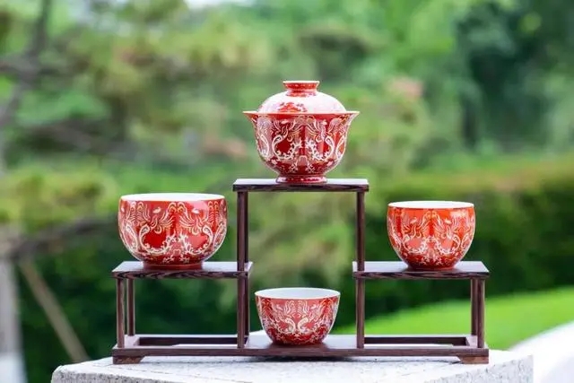 其中,粉彩錯金銀虎嘯鳳吟系列,是一件不可多得的佳器名品。整套茶具紋飾以館藏文物唐代金鳳飾件為設(shè)計靈感。金鳳雙翅展開,兩足蹬地,振翅欲飛的姿態(tài)生動逼真。在中國古代傳統(tǒng)文化中,鳳凰被視為瑞鳥,是鳥中之王。通過對金鳳飾件進(jìn)行提取,設(shè)計出鸞鳥紋,鳳紋羽翼展開可合為院徽圖形,整體構(gòu)成虎頭紋。茶具沿用藝林堂的粉彩工藝,采用錯金銀的呈現(xiàn)效果,不僅讓這只“鳳”更有“活性”,也讓器物更有精細(xì)感,正紅的底色也呈現(xiàn)出“紫禁紅”“中國紅”的極佳效果,在保留和傳播傳統(tǒng)文化的同時,也符合當(dāng)下的審美需求。
