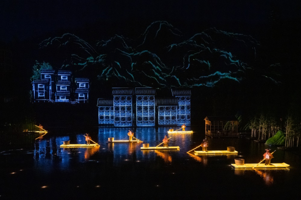 《竹?;镁场肥且郧谔医h的七年生活為核心打造的沉浸式楚風(fēng)竹宴劇場,主打“文化+科技+旅游”牌,劇中用數(shù)字技術(shù)升起隨 “超級月亮”相當(dāng)應(yīng)景,假期場場爆滿?!扒鄙磉厙鷿M粉絲,節(jié)目成了大型“追星現(xiàn)場”。雖然每場只能接待420人,但9月12日至17日就已經(jīng)賣出近3500張票。