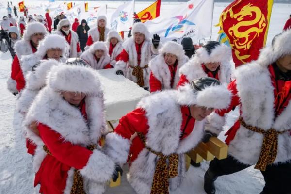 人們簇?fù)碇鴮⒉上碌牡谝粔K頭冰用紅布包裹著送到舞臺中央,祈福詞、出征酒、采頭冰、系鴻運(yùn)……一系列獨(dú)特的民俗儀式讓現(xiàn)場的市民、游客興奮不已?;馃岬牟杀顒硬粌H“燃動”松花江面,也成為游客享受冰上運(yùn)動與特色美食的熱門“打卡地”。江水煮餃子、江水燉江魚、美味凍貨冰雪宴讓中外游客樂在其中。結(jié)合了冰雪特色的文旅體驗(yàn)活動和文創(chuàng)產(chǎn)品也為采冰節(jié)增添了時尚元素。