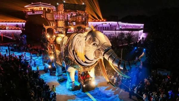 作為核心IP的大型仿生機(jī)械裝置吉象“壯壯”,在首次正式亮相中進(jìn)行多媒體技術(shù)與工業(yè)美學(xué)相結(jié)合的夜秀表演,與光影共同演繹了一場宏偉壯觀的視聽盛宴,讓在場的嘉賓、游客感受到了神象現(xiàn)世的震撼與奇幻。