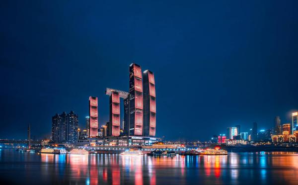 重慶來(lái)福士的“出圈”,首先源于其建筑設(shè)計(jì)與城市文脈的深度綁定。項(xiàng)目選址于重慶母城文化發(fā)源地朝天門(mén),這里曾是17座古城門(mén)中最大的一座,也是“重慶公路零公里起點(diǎn)”的所在地。設(shè)計(jì)師以“揚(yáng)帆遠(yuǎn)航”為核心理念,將八棟塔樓與橫跨250米高空的水晶連廊組合成“船帆”造型,呼應(yīng)了重慶千年航運(yùn)歷史。塔樓最大傾斜角達(dá)24°,弧形立面模擬風(fēng)帆鼓動(dòng)的動(dòng)態(tài)感,而水晶連廊則以300米長(zhǎng)度成為全球首座“橫向摩天樓”,其施工難度創(chuàng)下多項(xiàng)世界紀(jì)錄。