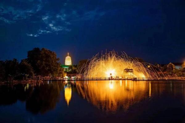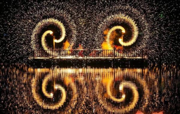 國家級非遺打鐵花技藝在漁灣景區(qū)獲得了前所未有的表達(dá)維度。這項(xiàng)始于北宋的古老技藝,曾只是單一的民俗表演,如今在數(shù)字技術(shù)的加持下煥發(fā)新生。2025版《夢幻漁灣》中,打鐵花已升級至2.0版本,與重慶銅梁火龍表演深度交融——表演者赤膊舞動(dòng)噴火巨龍,在鐵花飛濺的夜空下騰挪跳躍,形成“火樹銀花龍?jiān)谔臁钡钠嬗^。