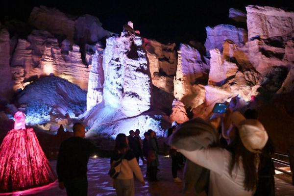 在萬象土林谷,夜幕降臨后,天地之彩、神秘山谷、部族史詩、七彩賜福四個(gè)篇章的實(shí)景演繹,讓游客在奇幻光影中體驗(yàn)裕固族神話的魅力。這一創(chuàng)新項(xiàng)目實(shí)現(xiàn)了景區(qū)與地域文化的完美結(jié)合,展示了張掖地域文化、景區(qū)地質(zhì)文化和肅南民族文化。