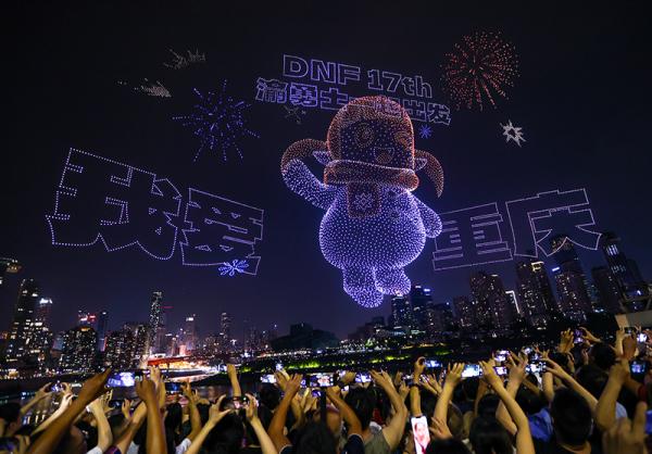 國(guó)際籃球巨星斯蒂芬·庫里親臨“新韻重慶”現(xiàn)場(chǎng)觀禮無人機(jī)光影秀,與全球玩家共賞“無畏契約×重慶朝天門”主題表演。千架無人機(jī)在長(zhǎng)江與嘉陵江交匯處騰空而起,以山城地形為畫布,勾勒出《無畏契約》的“皮蛋”造型,向庫里和全體觀眾大秀空中投籃與晚安禮。