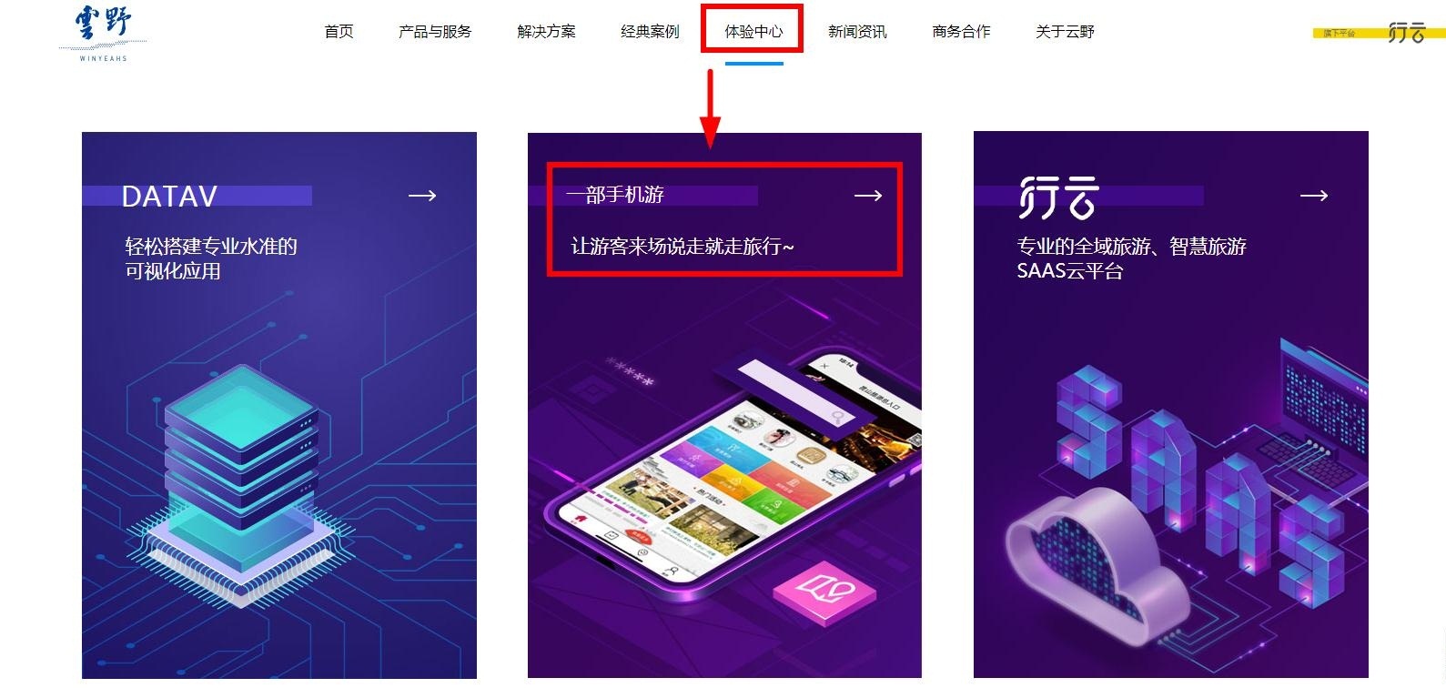 下面介紹下云野的“一部手機游”景區(qū)管理平臺軟件特色功能,如需要直接體驗的用戶可登入官網(wǎng)jsd-byq.cn,點擊導(dǎo)航欄“體驗中心”-------- “一部手機游”即可體驗。